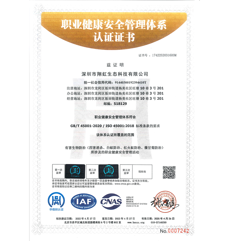 深圳市翔虹生態(tài)科技有限公司成立于1995年,是深圳最早成立的專業(yè)蟲(chóng)害防治公司之一。公司發(fā)展至今獲得全國(guó)有害生物防制服務(wù)A級(jí)資質(zhì)、廣東省有害生物防制服務(wù)A級(jí)資質(zhì)、深圳市有害生物防制服務(wù)A級(jí)資質(zhì)、廣東省有害生物防制服務(wù)A級(jí)資質(zhì)、深圳市有害生物防制服務(wù)甲級(jí)資質(zhì)的單位,是中國(guó)有害生物防治協(xié)會(huì)會(huì)員、廣東省有害生物防治協(xié)會(huì)會(huì)員、深圳市有害生物防治協(xié)會(huì)理事單位,多次獲得“深圳市十佳消殺單位”榮譽(yù)。